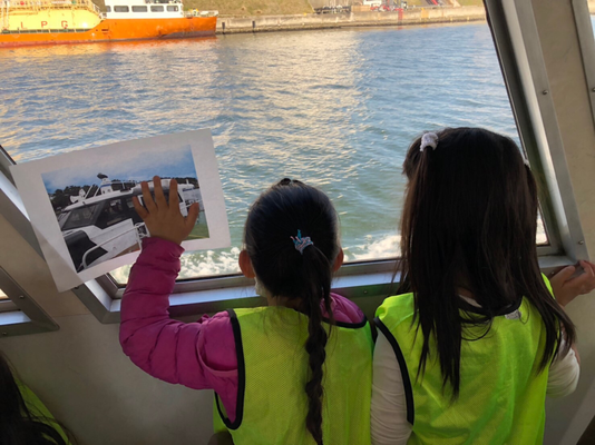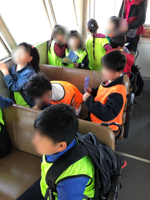 出発の前にユーリカ号の写真や、船の中の写真を見て予習タイム✨ビブスを着て車に乗ったらしゅっぱーつ‼️🚘
