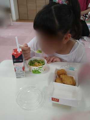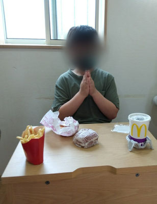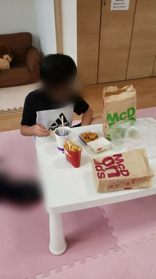 ハンバーガー🍔やポテト🍟等を美味しそうに召し上がっている皆さん👧👦