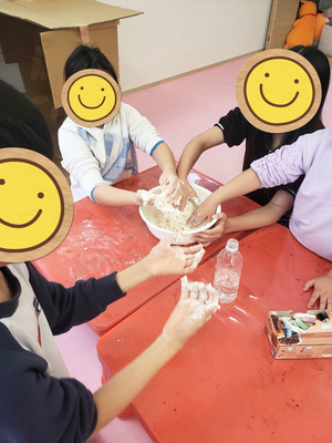小麦粉を使って小麦粉粘土をしましたよ🎵指先、手のひら、腕の力を存分に使ってコネコネ😌
